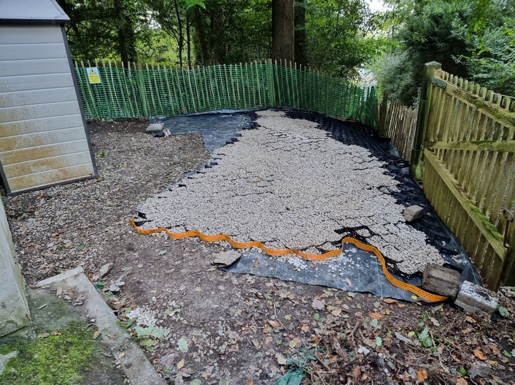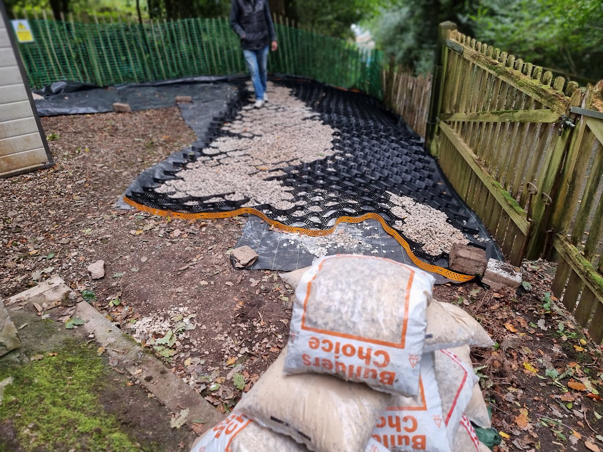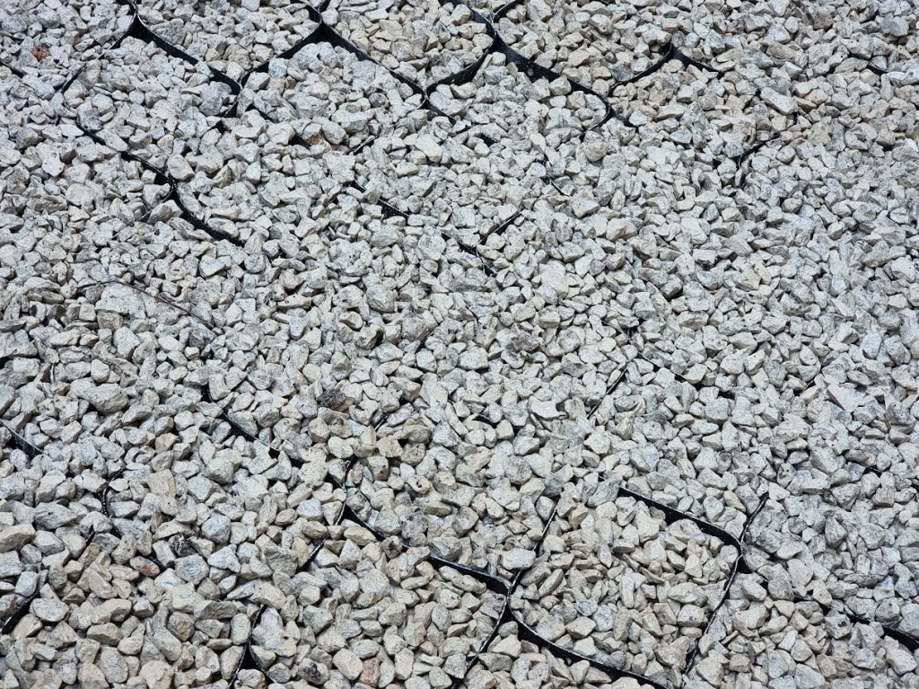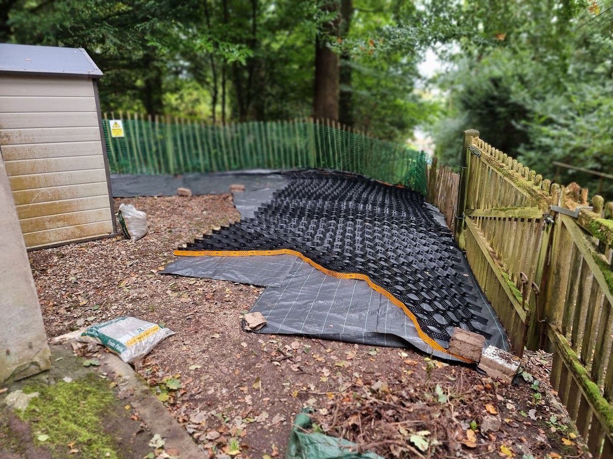 The ground where we worked needed to be protected with up to 4 inches of 20mm limestone aggregate, placed within a protective honeycomb structure to prevent the stones from shifting or becoming too thin. This was done to safeguard the roots of the surrounding trees and ensure they weren’t damaged during the work.