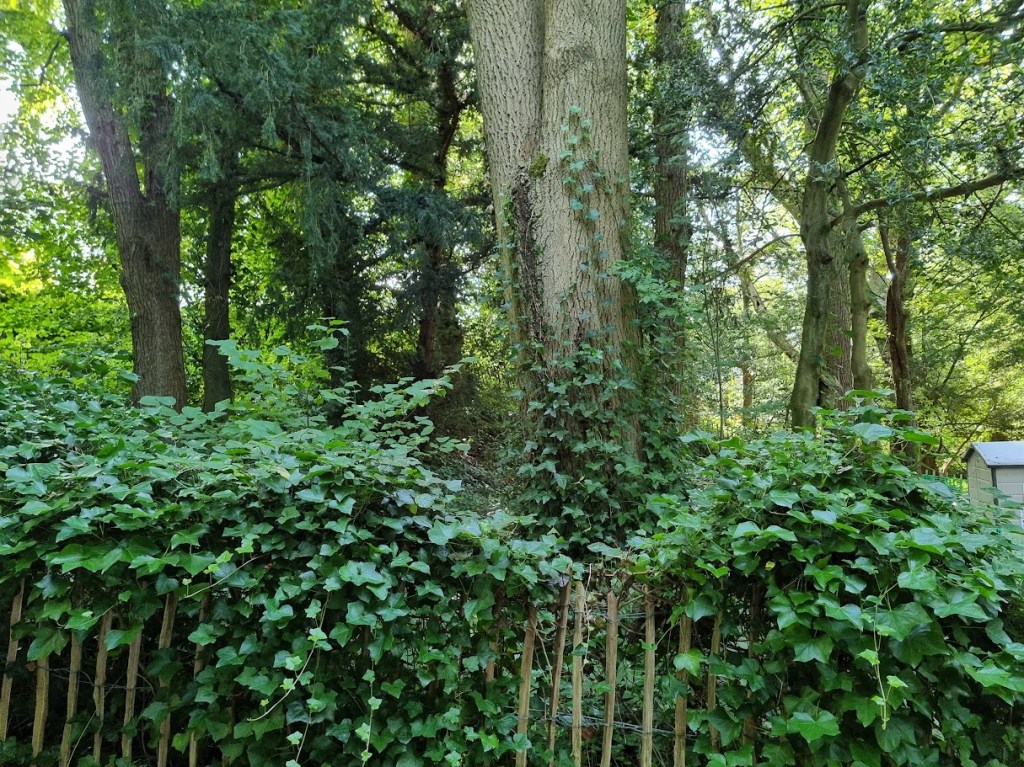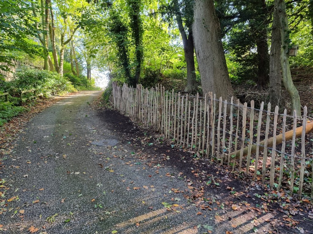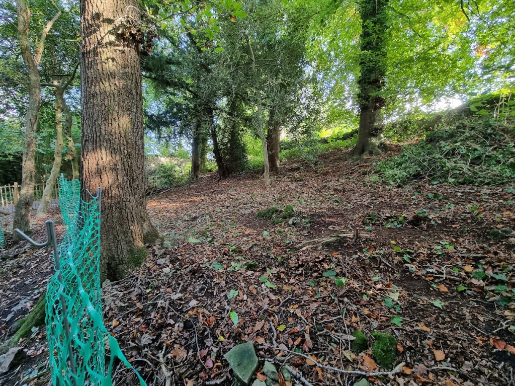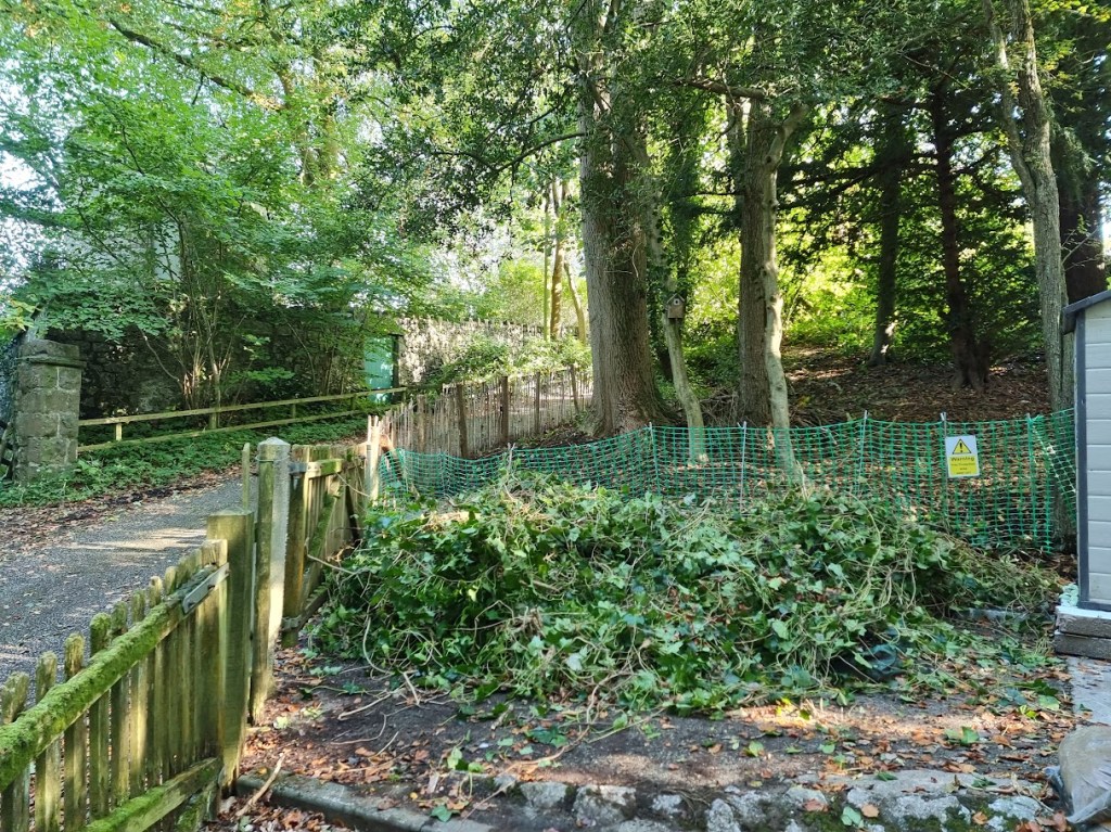 We cleared a lot of ivy, which is a fast-growing, vigorous plant. It’s often seen as a weed because it can quickly smother smaller plants and take over bare soil. On trees, it can cover up attractive bark, hide existing problems, and even overwhelm and outcompete species with thinner canopies. The whole area was covered in dense ivy, which was bringing down the fences and damaging the stone wall at the top. We thinned it out as best we could with the limited time we had before the nights closed in, making it too dark and cold a place to work until the following spring.